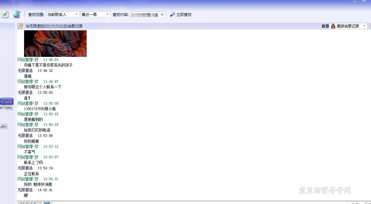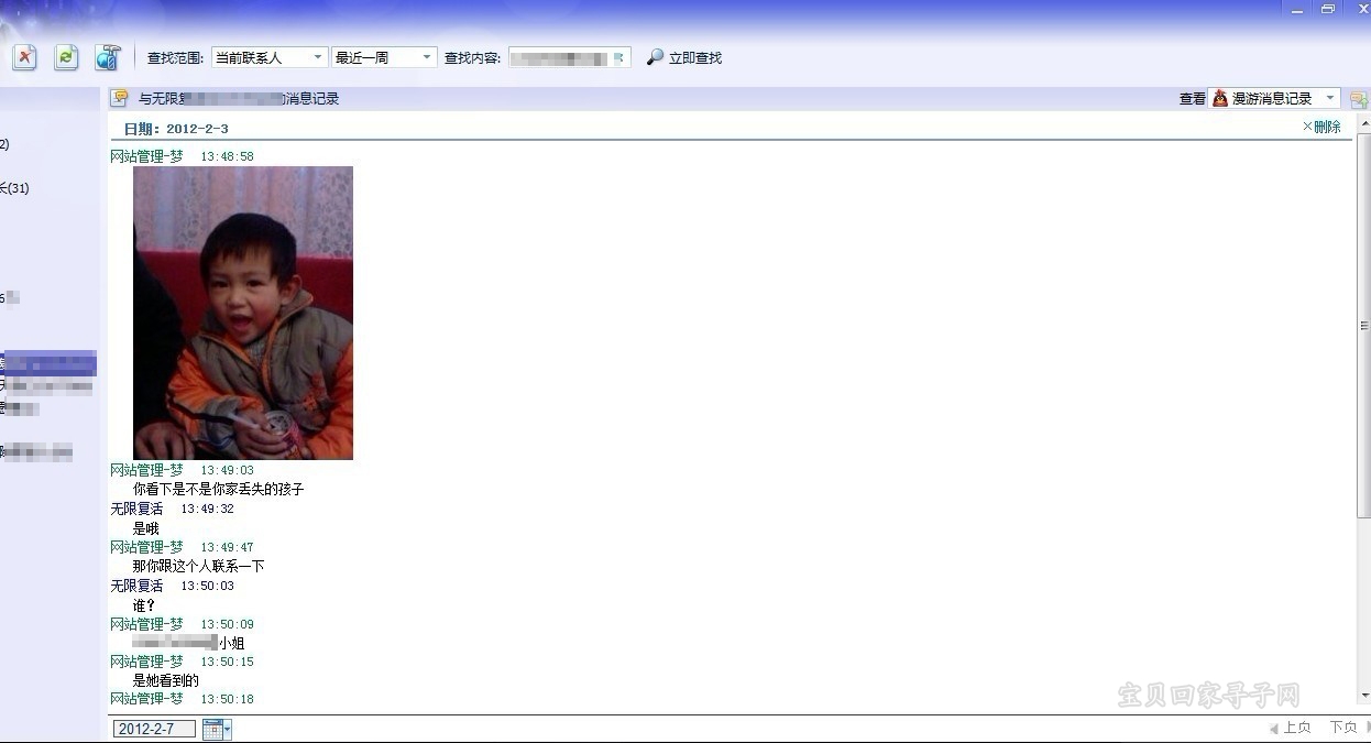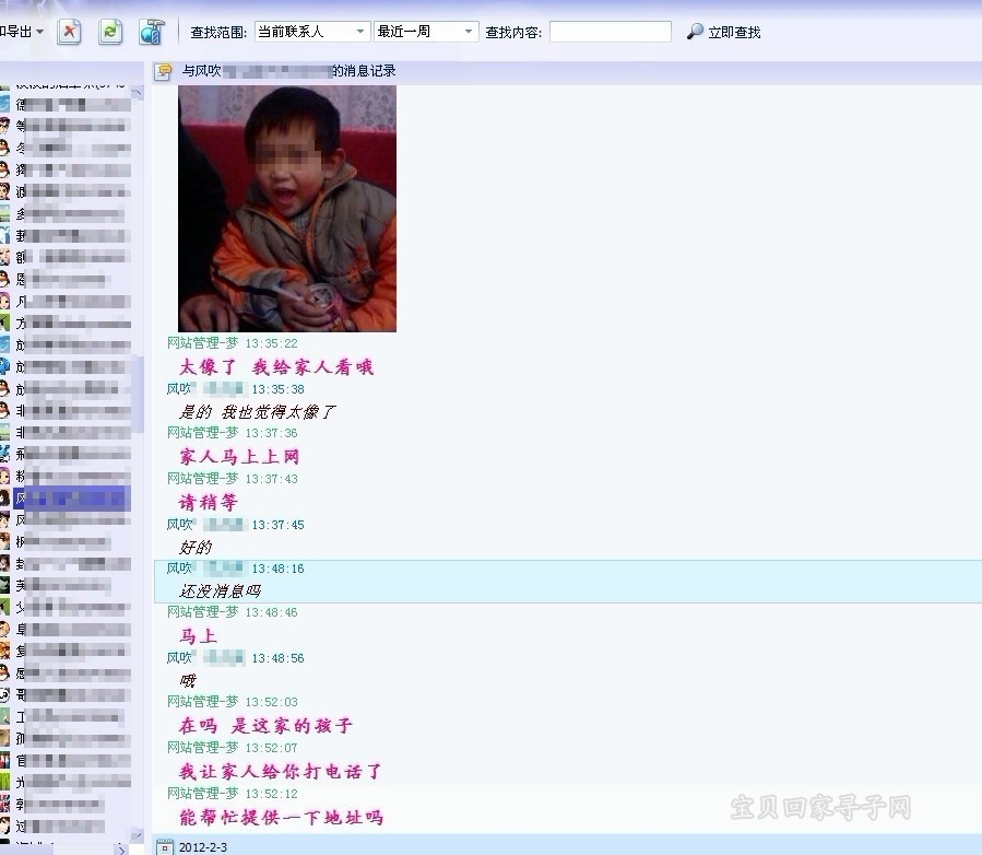 2月3日下午1点左右,网站管理-梦接到了江苏志愿者风儿笑的电话,说在微博上看到了一个孩子跟网站丢失的陈奥琳很像,希望联系家长进行确认,并用QQ把孩子的照片发给了网站管理-梦。梦看到照片上的孩子的确很像陈奥琳,网站管理-梦便立刻联系了孩子的父母,希望他们上网来确认一下,可是由于孩子的父亲正在车上,暂时无法上网,所以只能让表弟代替先上网来辨认一下。经过表弟辨认之后,确认这个孩子就是陈奥琳,于是网站管理-梦便把江苏志愿者风儿笑的电话告诉给了表弟,希望他们马上联系。