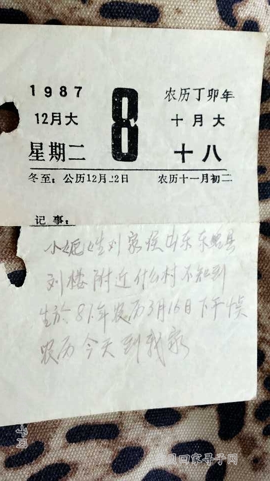 农历1987年3月16日出生阳历1987年12月8日从山东省菏泽市抱养的郭小妮寻亲