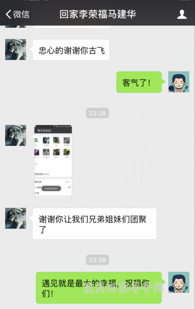 电话挂断后,古飞把所有的细节信息,养父母名字、工作单位、书信邮寄的照片等等一一整理,最终,得出结论,在微信平台和微博里留言的,确实是李荣福的亲人,当晚近23点,古飞将他们各自的联系方式给了对方,8个兄弟姐妹,终于在分开44年后,重新团圆了!7月3日,古飞收到了兄弟姐妹们发来的表达谢意的微信,而同时,在宝贝回家的微信平台上,再度出现了李荣福一家的报喜留言,同时也留下了感谢,小编也紧随留言,送上了我们的祝福——祝全家团圆,阖家幸福!