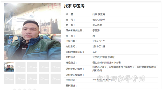 2017年,32岁的李玉涛决定找家了,他在央视等着我官方网站上登记了寻家信息: