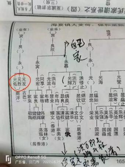 从2018年开始,甄于雯一直在努力为家族寻根。她求助同乡会、姓氏会,研究长辈骨灰瓮的铭文,与世界各地的台山老乡交流,上网查资料……但都没有找到明确的故乡线索。2020年,甄于雯在马来西亚的旧家中发现了一张红纸,纸上按辈分列出了全家人的姓名和出生时间。唯独爷爷的名字写的不是“甄源志”,而是大家此前从未听过的“甄芹香”。因此,甄于雯推测爷爷可能变更过自己的名字。