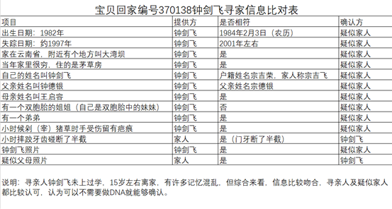 从这个比对表上可以看出,钟剑飞是宗吉荣的可能性非常大。在征求双方意见时,钟剑飞和父母及弟弟均表示,信息相符,照片确凿,不用再做DNA,肯定是一家人没有错。
