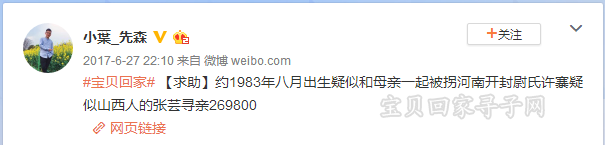 就在这时,志愿者小叶先森给卫兵带来了喜讯:小叶先森将帖子扩散到了自己的微博上,立刻有人通过微博私信联系上了小叶先森。对方自称张芸的表哥,听说有人在打听他们的信息,便在6月18日深夜与小叶先森取得了联系,希望能帮助联系张芸: