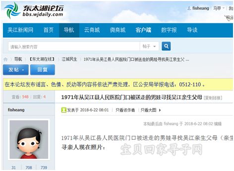 根据当年送养的地点,小河小鱼在吴江县东太湖论坛上发布了吴江的寻亲帖: