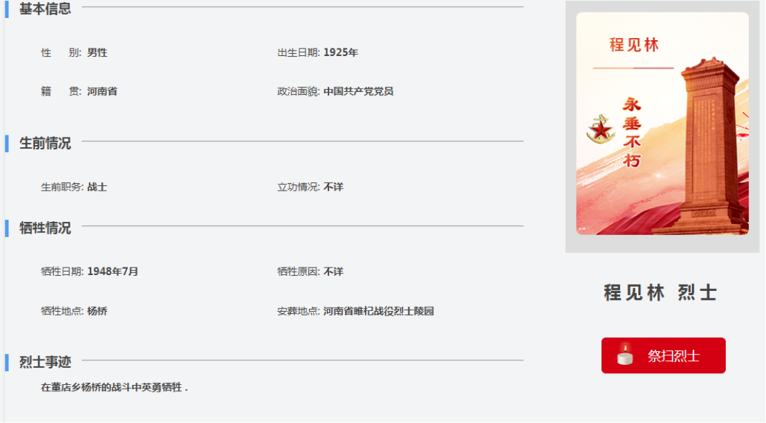 另有一位程见林烈士,也就是卢主任提供的安葬在睢杞烈士陵园的烈士,这位烈士资料记载显示:程见林烈士,出生于1925年,1948年在董店杨桥的战斗中牺牲,现安葬于河南睢杞烈士陵园。