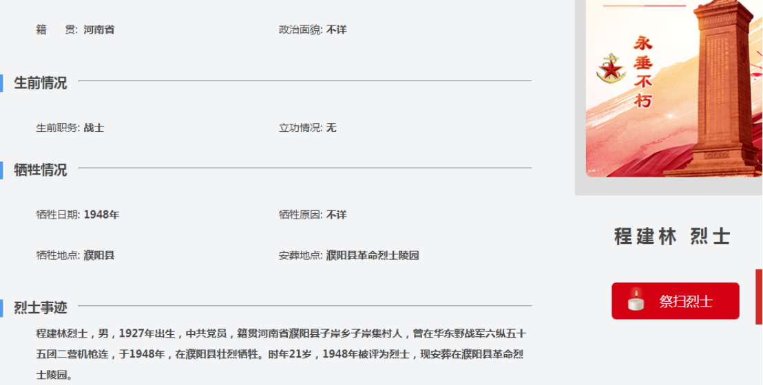 12月8日,半杯清茶在中华英烈网查询发现,有一位叫程建林的烈士,资料记载显示:程建林烈士,男,1927年出生,中共党员,籍贯河南省濮阳县子岸乡子岸集村人,曾在华东野战军六纵五十五团二营机枪连,于1948年,在濮阳县壮烈牺牲。时年21岁,1948年被评为烈士,现安葬在濮阳县革命烈士陵园。