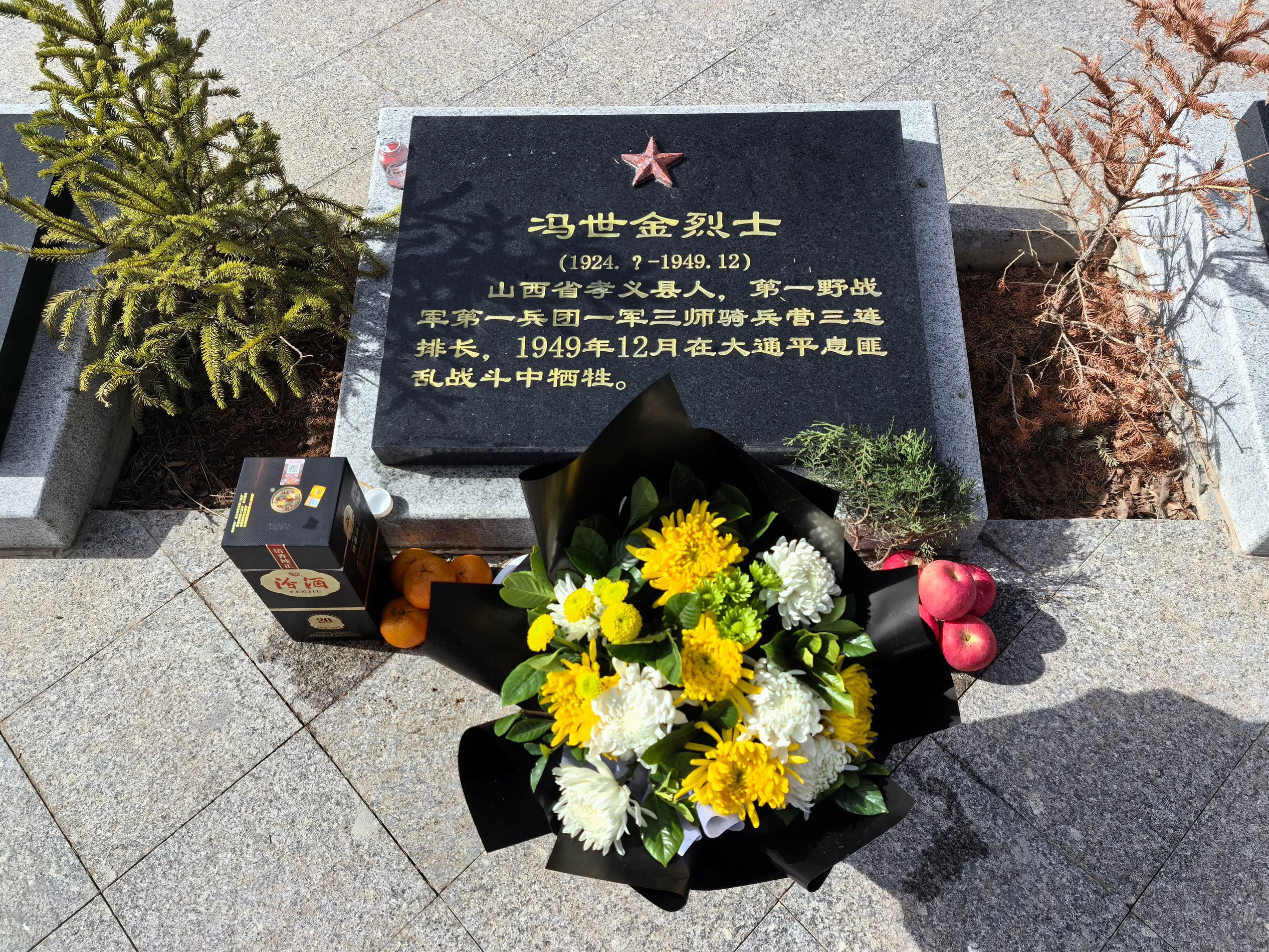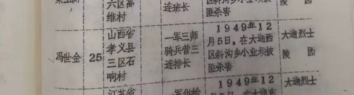 陵园资料记载:冯世金烈士原籍山西省孝义县三区石响村,生前在一军三师骑兵营三连担任排长一职,1949年12月5日,在大通西区斜沟乡小业坝被土匪杀害,英年25岁。