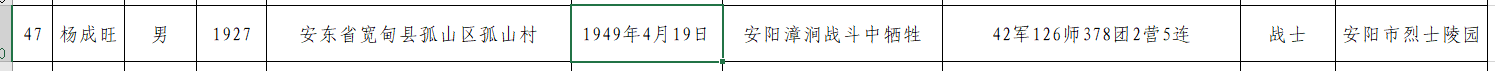 时年22岁的杨成旺烈士光荣牺牲于此次战役中,后安眠于河南省安阳市烈士陵园。陵园资料记载,烈士生卒1927年-1949年,原籍安东省宽甸县孤山区孤山村,生前所在部队42军126师378团2营4连。