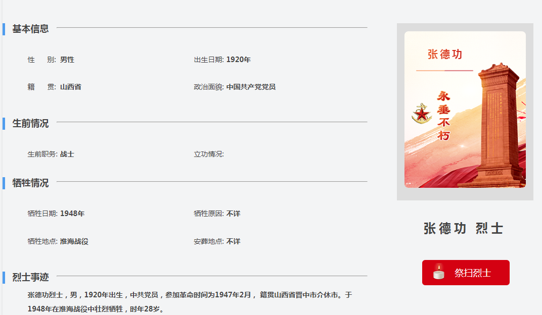 2024年1月25日,宝贝回家烈士寻根工作组志愿者今生整理张德功烈士资料,资料记载,烈士原籍山西介林县一区东洋屯,26岁,1948年12月在淮海战役中楼战斗牺牲,中国人民解放军一三旅三八团排长。