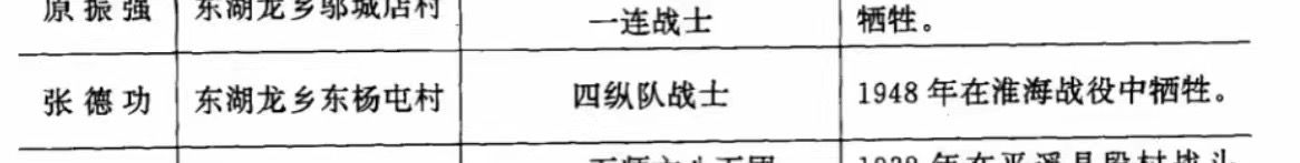 县志所记载的“东湖龙乡东杨屯村”,网络搜索显示“东杨屯村”分别为“河北省沧州市任丘市长丰镇东杨屯村”和“山西省晋中市介休市连福镇东杨屯村”。中华英烈网显示,张德功烈士1920年出生,中共党员,参加革命时间为1947年2月, 籍贯山西省晋中市介休市。于1948年在淮海战役中壮烈牺牲,时年28岁。