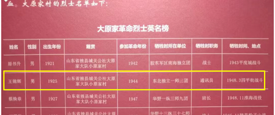 《英名榜》显示:烈士1925年出生,原籍山东省掖县城关公社大原家大队小原家村人,1944年入伍于东北独立一师三团,担任通讯员,1948年3月牺牲于四平街战斗。