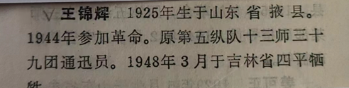 王锦辉烈士,1925年出生,原籍山东省烟台市莱州市,1948年3月在吉林省四平市光荣牺牲,生前入伍于中国人民解放军第五纵队十三师三十九团。