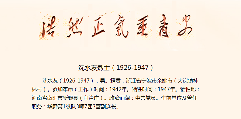 随后住在秋天通过“浙江英烈网”查询到:沈水友烈士,生卒1926-1947,浙江省宁波市余姚市(大岚镇柿林村),1942年参加革命,中共党员,1947年在河南省南阳市新野县白湾庄牺牲,生前担任华野第1纵队3师7团3营副连长。