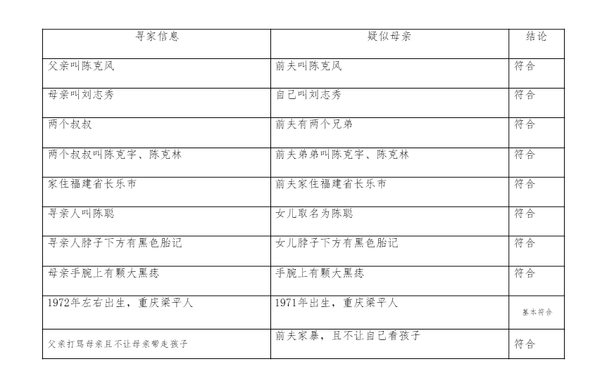 从比对表上很明确的看出双方具有极高的相似度,金兰分析判断河北刘志秀就是陈聪要寻找的母亲,也因为此,寻亲和被寻人都认为信息全部相符,没有必要做DNA。征得网站同意,金兰建立了一个微信群,在网站管理和参与走访志愿者的共同见证下,陈聪和刘志秀以微信群视频方式相认了,在视频过程中双方核实了更多细节均一一符合,至此陈聪寻找母亲刘志秀案例圆满结束。