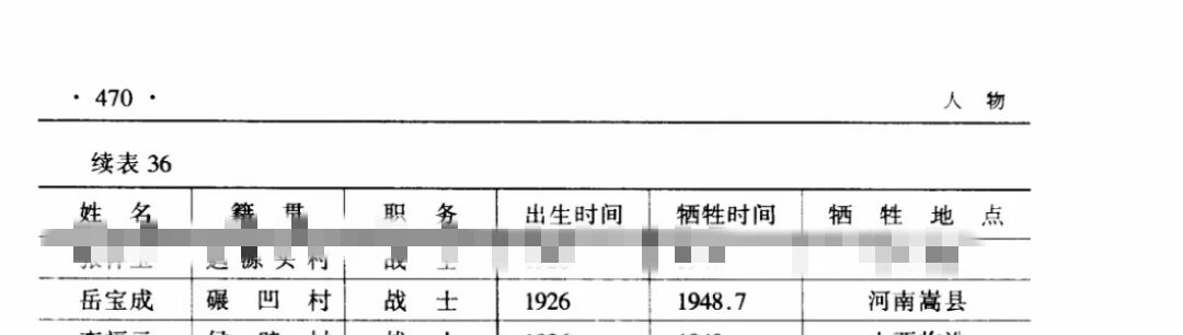 此帖发出后,引起了志愿者今生的关注。他查询了“平顺县县志英名录”,了解到岳保成烈士为山西省长治市平顺县虹梯关乡碾凹村人。