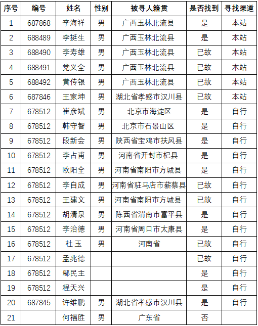 附所有被寻人名单及寻找情况如下: