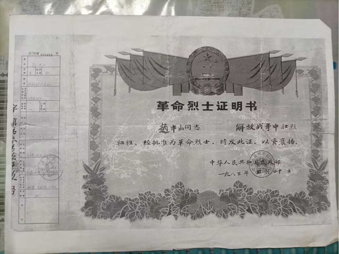 资料显示:赵中山烈士出生于1926年,家庭住址是山西省长治市屯留区上村乡北宋渡村;烈士1947 年入伍,生前是中国人民解放军某部二十九团战士,1948年在淮海战役中英勇牺牲。今生看到烈士牺牲于淮海战役中,便把案例信息发给了烈士寻根工作组的志愿者一个人的天涯,请他帮助查找。