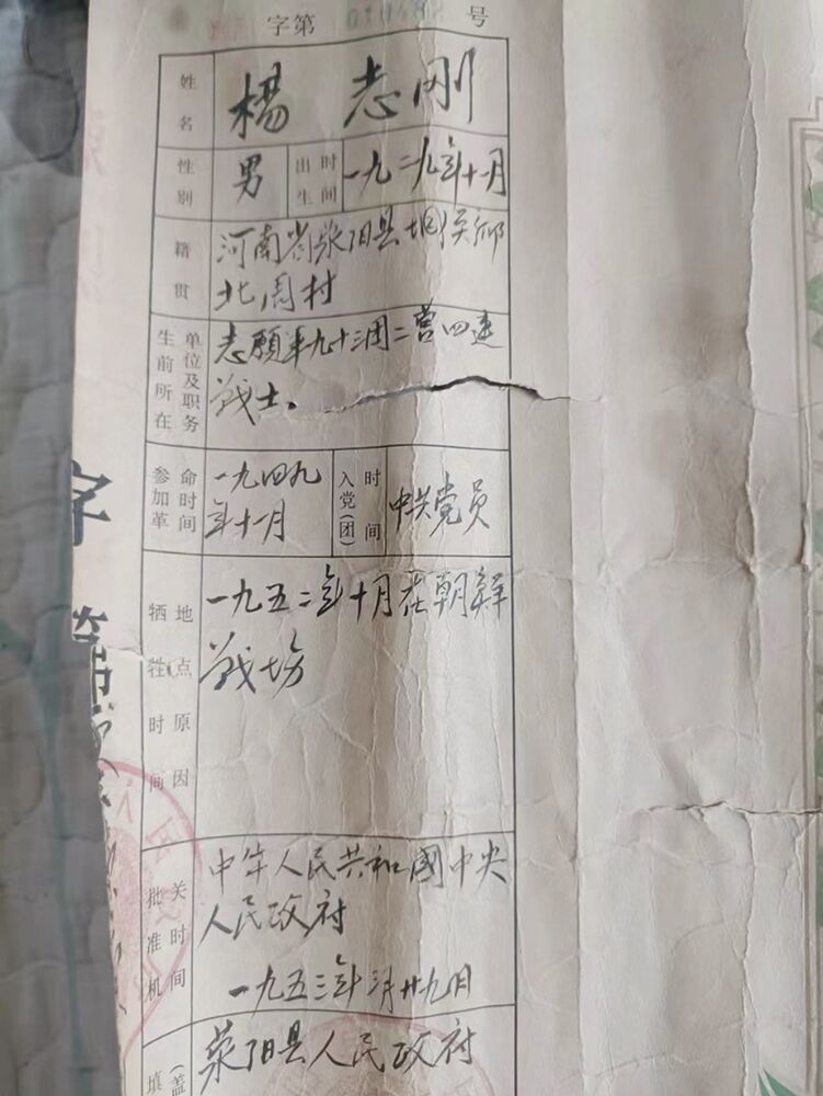 1929年出生1952年牺牲祖籍河南省郑州市荥阳市城关乡 杨志刚烈士静待家人637617