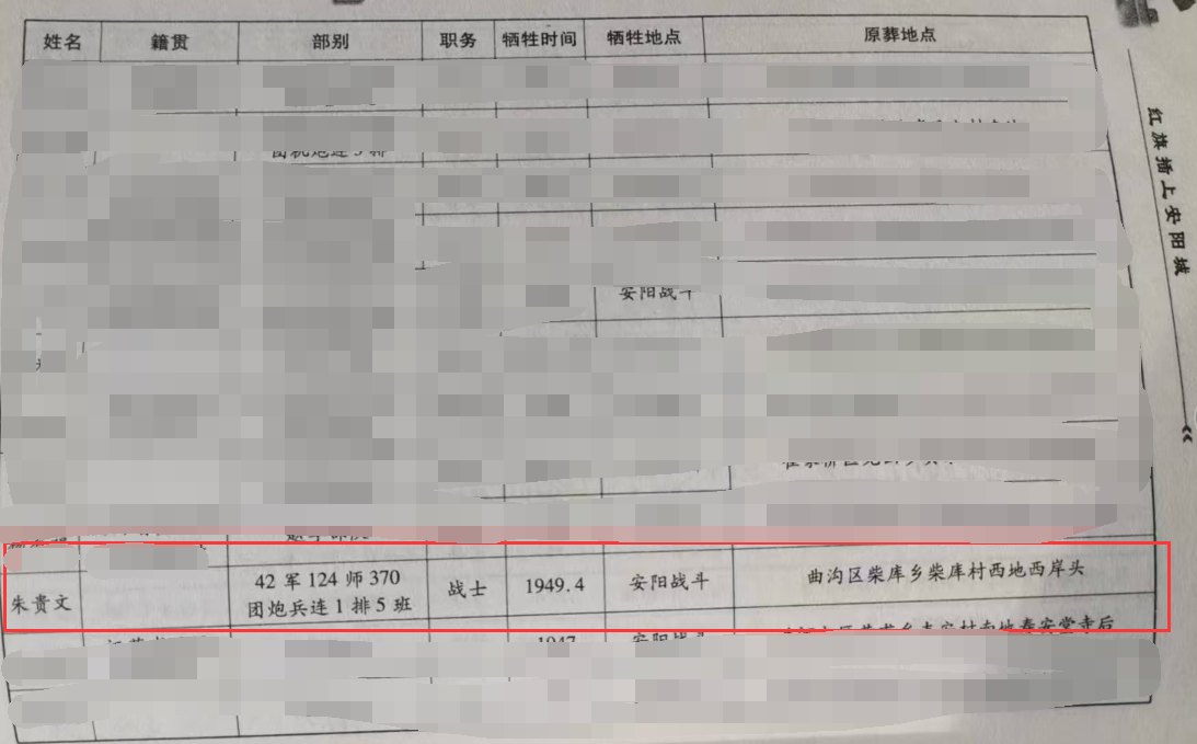 经过原安阳市委地方史志研究室宣传教育科科长聂亚琦、市委党史研究室国史科科长倪晓、安阳县烈士陵园负责人刘爱军、党史爱好者吴生来等人证实,当年参加安阳战斗的部队确实是四十二军而非四十一军,而朱贵文烈士的资料也在倪晓科长发来的档案中得到佐证,烈士原葬地为:曲沟区柴库乡柴库村西地西岸头,后迁至安阳烈士陵园。