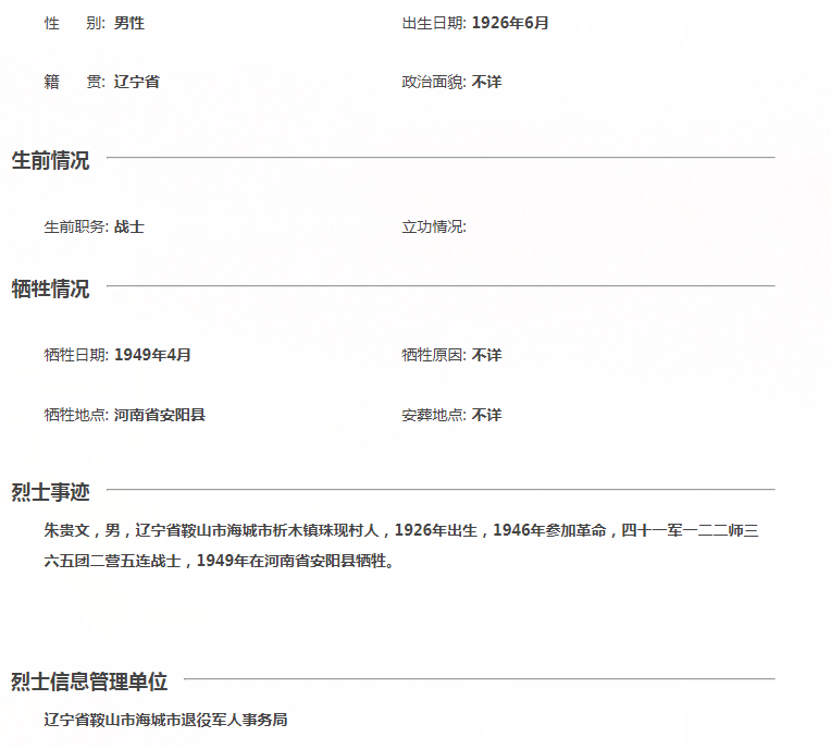 2025年2月7日,宝贝回家烈士寻根工作组志愿者半杯清茶接到为朱贵文烈士寻家的任务。初期线索寥寥:资料未提供原籍地,查询中华英烈网显示其籍贯为辽宁省鞍山市海城市析木镇珠现村;资料记载烈士所属部队为四十二军,中华英烈网却显示为四十一军,这一矛盾成为破解谜题的关键。