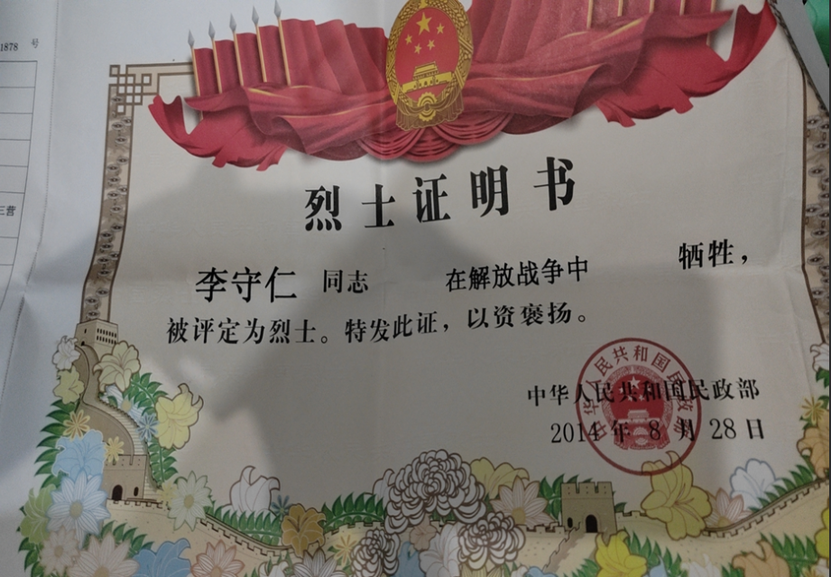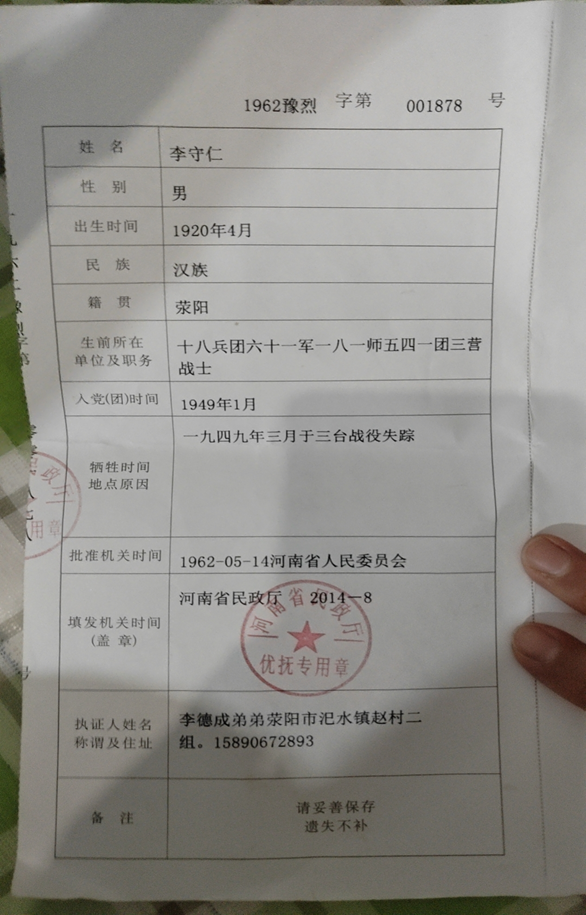 从李守仁烈属手中出示的烈士证上,我们看到,烈士原名确为李守仁,而非李守忍,烈士出生于1920年4月,1949年1月入党,同年3月于三台战役失踪,1962年5月14日河南省人民委员会批准授予烈士称号,2014年8月,河南省民政厅颁发了烈士证书。