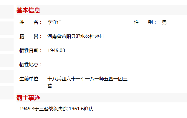 寻找1920年出生1949年三台战役牺牲河南省荥阳市汜水镇 李守仁烈士安葬地691752