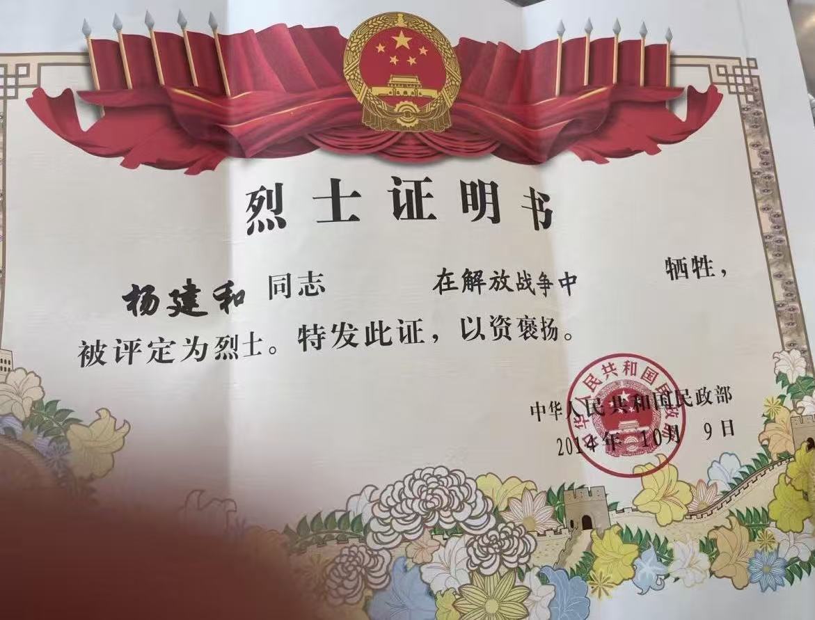 为了让更多人了解杨建和烈士的事迹,助力寻亲工作,小墨分别于2025年12月18日和12月22日精心制作了杨建和烈士寻亲视频,并发布在抖音平台。命运的齿轮开始转动,这两条视频被烈士妹妹的孙子徐越刷到。徐越激动地表示,杨建和烈士是奶奶的亲哥哥。徐越随后给小墨发来了杨建和烈士的证明书,让这份跨越时空的亲情有了确凿的证据。