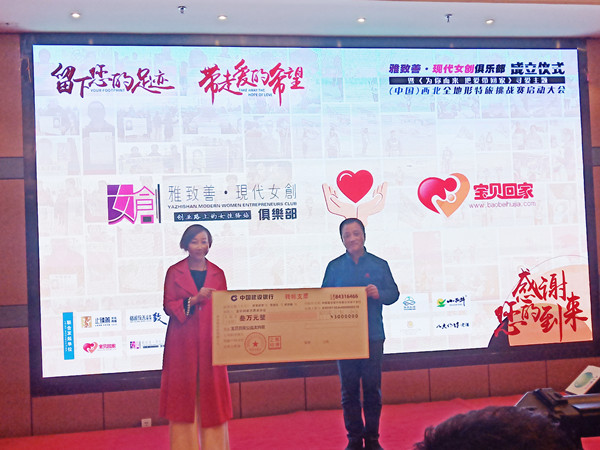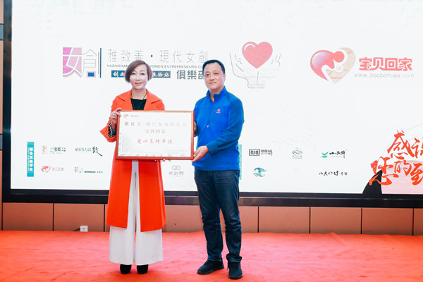 雅致善现代女创俱乐部理事长陈芊含女士上台分享了她创办俱乐部的初心,并表示俱乐部将全力支持宝贝回家,陪伴着寻子妈妈们一路前行。启动仪式上,陈芊含女士现场捐赠了三万元,用于宝贝回家开展寻亲工作,秦艳友代表宝贝回家接受了捐款,并授予俱乐部“爱心支持单位”称号。
